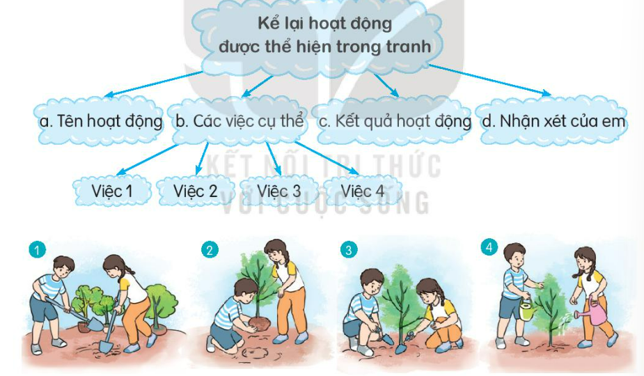 Đó là bức tranh nói về hoạt động của hai bạn nhỏ đang tích cực cùng trồng cây để thiên nhiên tươi đẹp hơn. Đầu tiên các bạn lấy xẻng và tập trung vào đào hố trồng cây. Sau khi đào hố xong, hai bạn đặt cây ngay ngắn vào giữa hố vừa đào. Các bạn tiếp tục dùng cái bay để vun đất lấp vào gốc cây. Bước cuối cùng là hai bạn múc nước tưới cho cây để cho gốc cây luôn ẩm ướt giúp cây phát triển nhanh. Kết quả là các bạn đã trồng được thêm một cây xanh trong vườn trường. Em thấy việc làm này thật vui và có ý nghĩa, giúp cho ngôi trường của chúng ta luôn xanh, sạch, đẹp hơn. Nếu có cơ hội em cũng rất muốn tham gia vào hoạt động trồng cây xanh giúp chúng ta bảo vệ môi trường.