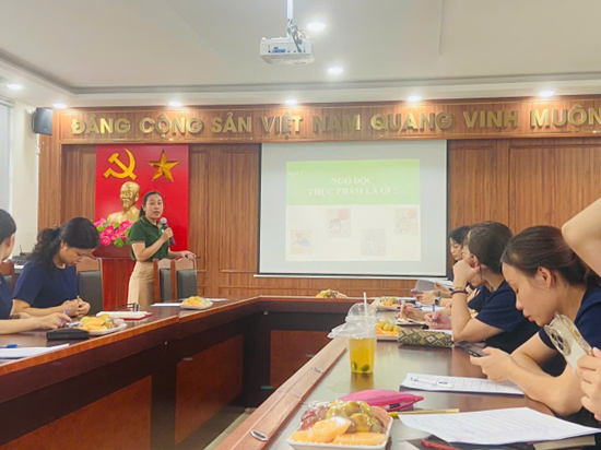 Đến dự và làm báo cáo viên của buổi tập huấn là đồng chí Trần Thị Khánh Linh – đồng chí phụ trách y tế. Đồng chí Trần Thị Khánh Linh đã tập huấn cho CBGVNV nhà trường những kiến thức cơ bản về công tác đảm bảo an toàn vệ sinh thực phẩm trong trường học, những quy định về giám sát, kiểm tra các bước trong quy trình thực hiện công tác bán trú, những lưu ý về hồ sơ, sổ sách, cách xử lý ngộ độc thực phẩm… Đó thực sự là những kiến thức bổ ích, thiết thực, giúp CBGVNV nhà trường hiểu rõ và hiểu đúng về ý nghĩa, vai trò, cách thức thực hiện đảm bảo an toàn thực phẩm trong nhà trường.