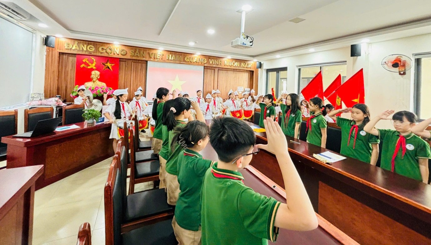 Mở đầu Đại hội là nghi lễ chào cờ trang nghiêm. Mang trong mình nỗi xúc động và niềm tự hào dân tộc, các bạn đội viên đã cất cao giọng hát hòa trong giai điệu của bài hát quốc ca và đội ca. Và rồi các bạn đã cùng đồng thanh hô “Sẵn sàng”! Tiếng khẩu hiệu to và dõng dạc của các bạn đã thể hiện tinh thần đoàn kết, nỗ lực phấn đấu, ý chí quyết tâm học tập và rèn luyện thật tốt trong năm học 2024- 2025.
