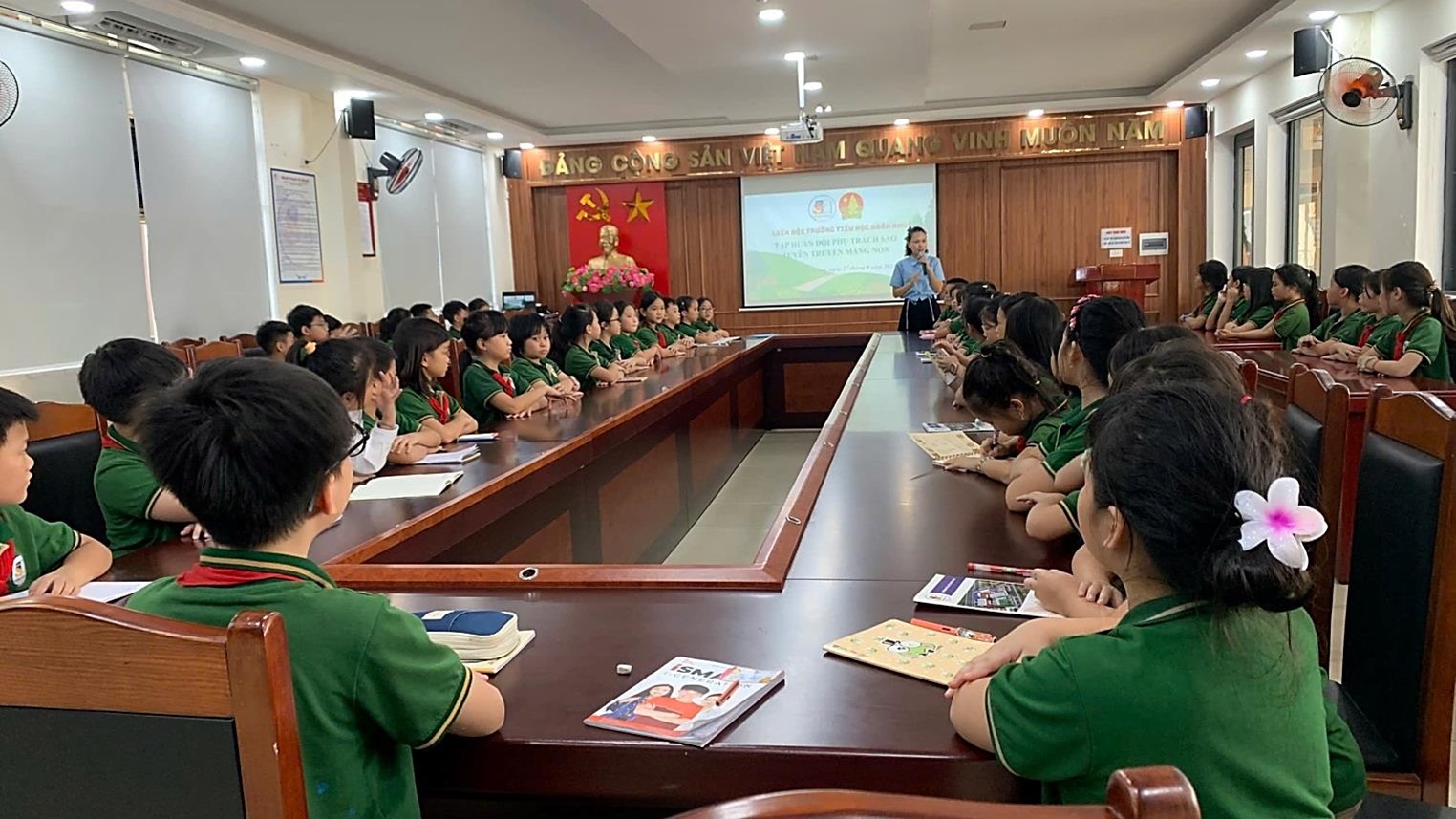 Các bạn Phụ trách Sao khối 4,5 hào hứng tham gia buổi tập huấn. Hy vọng rằng với những kiến thức, kinh nghiệm được truyền đạt trong buổi tập huấn sẽ giúp các bạn tự tin tổ chức sinh hoạt sao tại các lớp Nhi đồng trong năm học 2024-2025.