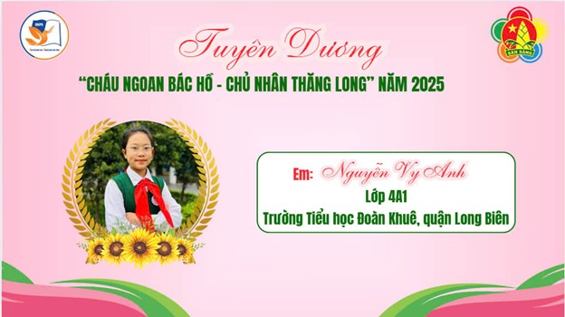 Luôn dẫn đầu về học tập và rèn luyện, em Nguyễn Vy Anh, học sinh lớp 4A1 là một trong những bông hoa nhỏ khoe sắc rực rỡ trong vườn hoa nghìn việc tốt của thiếu nhi Thủ đô kính dâng lên Đảng, Bác Hồ kính yêu trong Đại hội Cháu ngoan Bác Hồ Thành phố Hà Nội lần thứ XV.