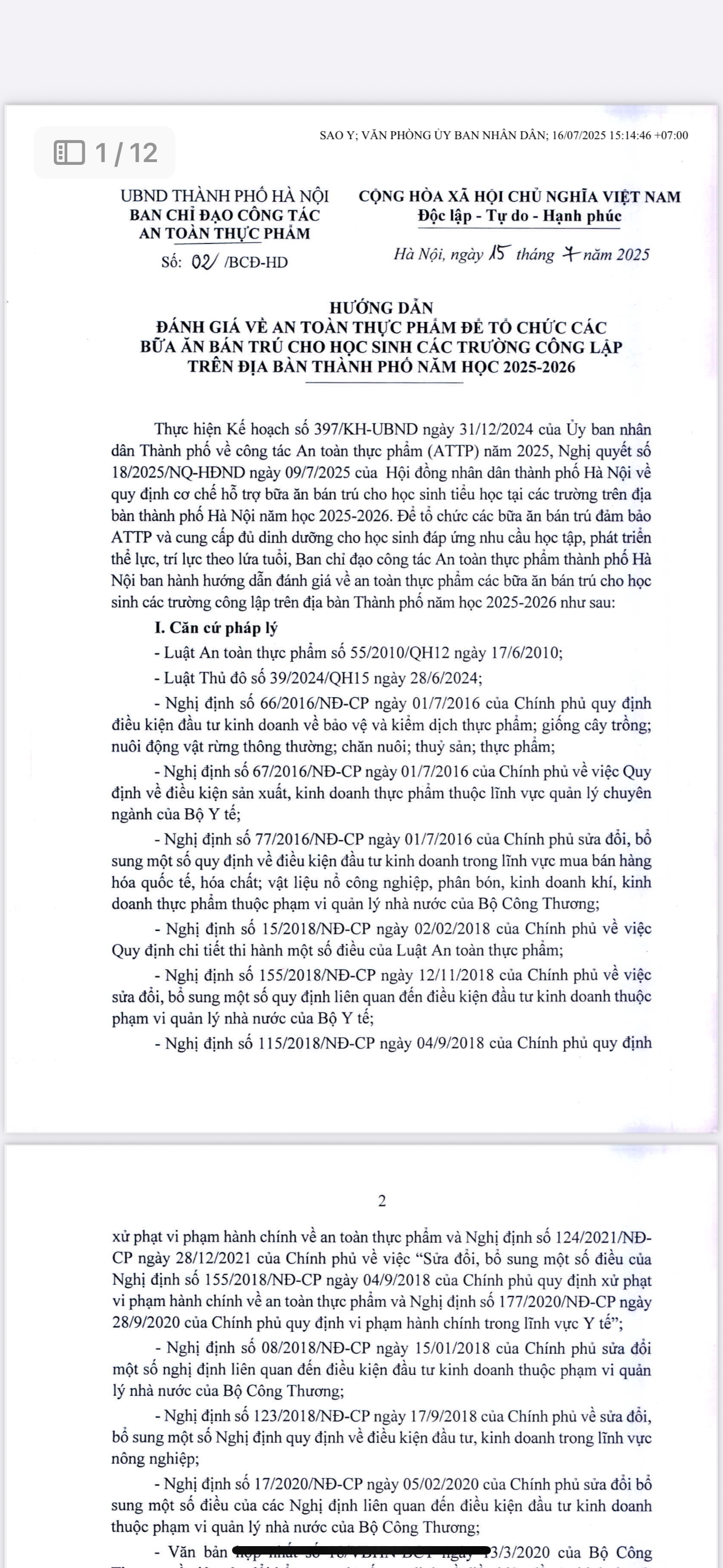 Hướng dẫn đánh giá về an toàn thực phẩm để tổ chức các bữa ăn bán trú cho học sinh các trường công lập trên địa bàn thành phố năm học 2025 - 2026